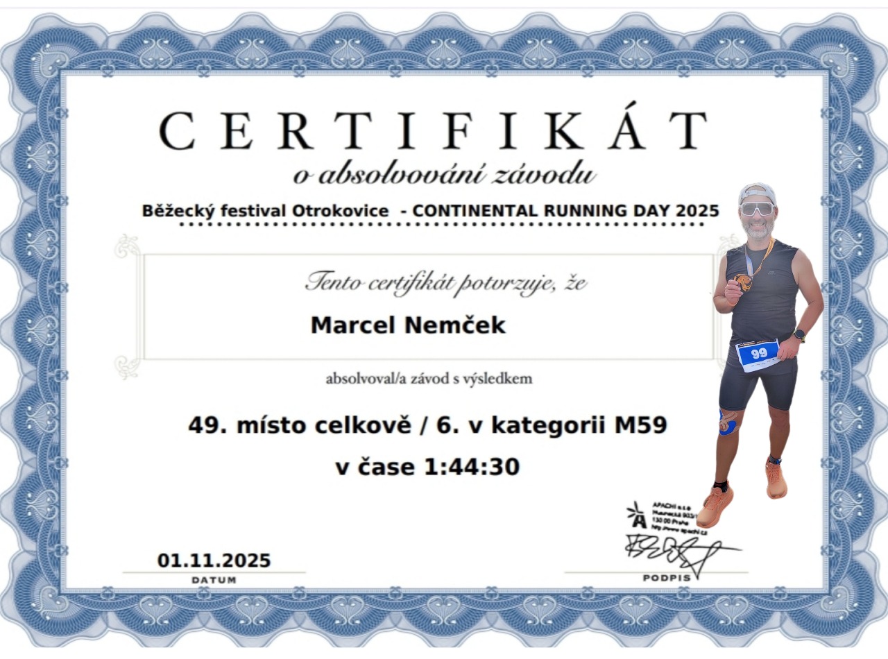 Předseda klubu M. Nemček (47let) běžel štafetový úsek v půlmaratonu za město OTROKOVICE v čase 13:29,00 min.